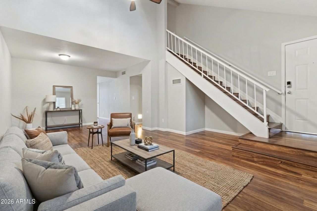 PRICED TO SELL!! Beautifully maintained two-story townhome in the desirable Castle Rock community of Peoria. Bright open floor plan with vaulted ceilings, wood-look flooring, neutral paint, and abundant natural light. Kitchen features granite countertops, stainless steel appliances, ample cabinetry, and dual sliding doors for seamless indoor-outdoor living. Spacious primary suite with ensuite bath, generous closet space, and backyard access. Low-maintenance backyard with paved patio. Conveniently located near parks, shopping, dining, and easy access to Loop 101 & US-60.