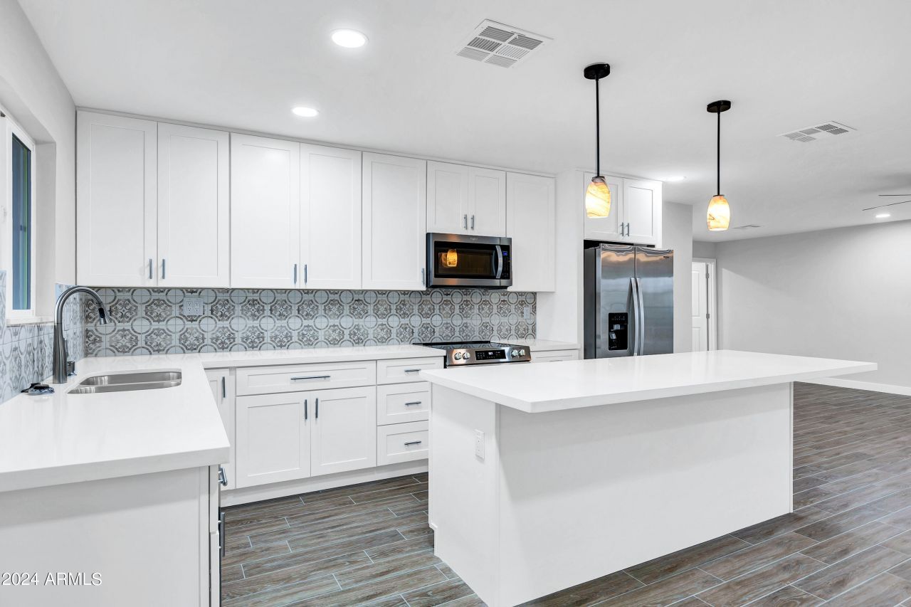 Welcome to this stunning remodeled house in Sun City. This house has been completely redone from top to bottom including all new plumbing, electrical wiring, a new garage and an additional bedroom. As you walk into the home, you are greeted with a large great room that embodies an open concept design. Tile flooring runs throughout the house excluding the bedrooms. The kitchen features a large island with bar seating space, brand new quartz countertops and modern shaker cabinets. The kitchen also comes with all new stainless appliances. The house has a split floorpan with each bedroom possessing new carpet and black modern ceiling fans. Both bathrooms feature beautiful floor to ceiling tiled showers. The backyard has a large covered patio, perfect for enjoying the Arizona weather.