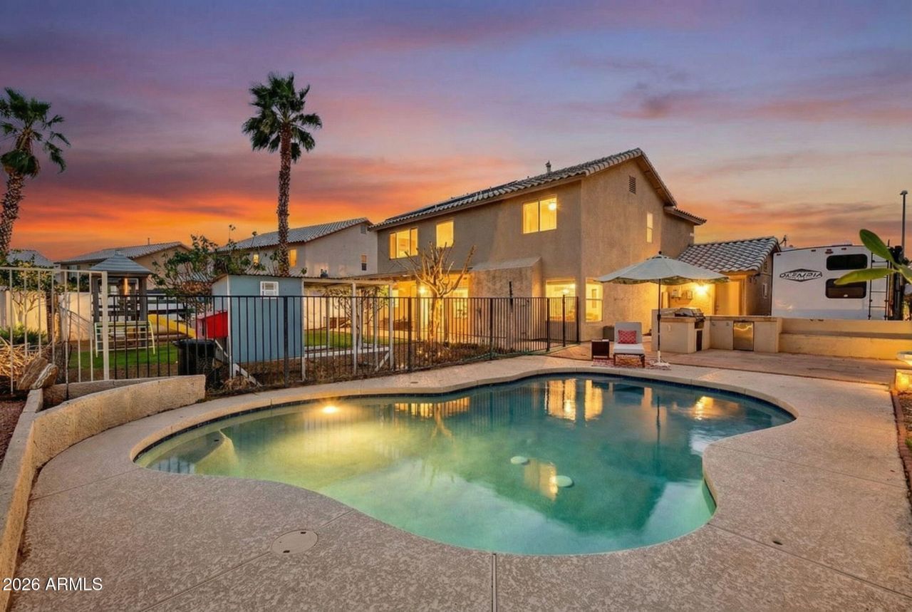 Now you can live the homestead lifestyle in North Peoria- at an incredible price point. Dont be fooled by the Sun City mailing address, this home is located in North Peoria and is NOT age-restricted. This meticulously maintained property offers a rare combination of sustainability, flexibility, and comfort.The backyard is fully set up for homestead living, featuring an adult and baby chicken coop, organic garden beds, and mature citrus and fruit trees including mulberry, apple, peach, fig, mandarin and more. Years of care have gone into creating a productive, move-in ready outdoor space that allows you to grow your own food while enjoying the convenience of city living.With no HOA, you have true freedomThe property includes RV parking with a 30-amp plug, OWNED solar panels, and smart home features including connected doorbell, thermostats, and lighting.Inside, all bedrooms are located upstairs, creating a functional separation between living and private spaces. The main level offers multiple living areas with an open-concept layout, beautiful granite countertops in the kitchen, a double oven for the house chef, and charming bathroom updates that add warmth and character throughout. The spacious primary suite is a true retreat, complete with a generous layout and its own sitting area.The former third-car garage has been converted into a versatile flex space complete with heating and cooling - ideal for a home office, gym, business space, or guest area -and can easily be returned to a third-car garage if desired. Ample storage remains with built-in garage cabinets and a dedicated work bench.Designed for both everyday living and entertaining, the backyard features a huge covered patio, fenced Pebble Tec pool, outdoor kitchen with built-in BBQ and mini fridge, built-in adobe-style kiva fireplace, and a playground -- creating a space that truly brings people together.This is a rare opportunity to own a home that blends homestead potential, smart upgrades, flexible living space, and lifestyle-driven amenities -all in this sought after North Peoria location.