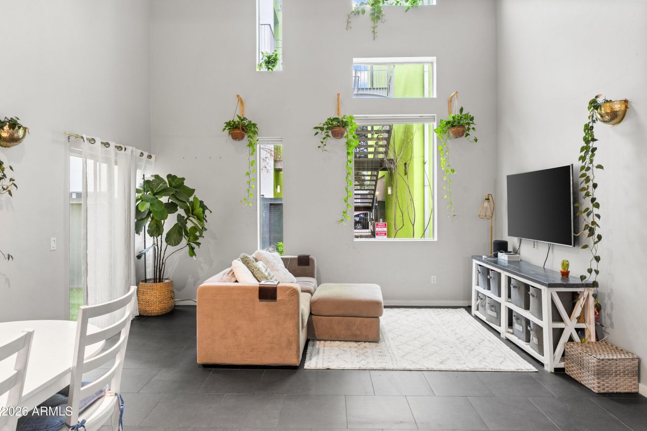 MidCentury Modern townhouse in a gated Tempe community designed by renowned architect Will Bruder. This light-filled interior unit features ground-floor entry with a full bedroom and bath downstairs, plus an open loft and spacious primary en-suite upstairs. No upstairs neighbor. Private outdoor patio just steps from the pool, spa, and fitness center. Chic kitchen and bathrooms reflect classic MCM design. Includes underground parking, storage, and a 1-year-old A/C. HOA covers water, sewer, trash, roof repair/replacement, and common areas. Near ASU, Sky Harbor, Tempe Town Lake, Mesa Riverview, and Cubs Spring Training. Ideal lock-and-leave or investment opportunity with architectural character and walkable convenience.