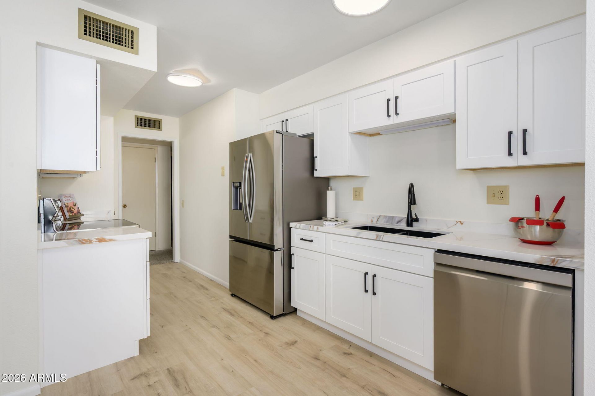 Welcome to Sun City living with golf course views! This expanded Woodbury model sits on a premium 9,701 sq ft lot overlooking the 8th fairway of Quail Run Golf Course. Offering 2 bed, 2 bath, this home features thoughtfully updated kitchen and bathrooms, creating a fresh and inviting interior. Enjoy the convenience of a 2-car garage plus dedicated golf cart garage. The spacious backyard is ready for your personal design and outdoor vision. Ideally located near the US-60 and Loop 101, with easy access to shopping, dining, and recreation. Experience comfort, convenience, and the Sun City lifestyle.