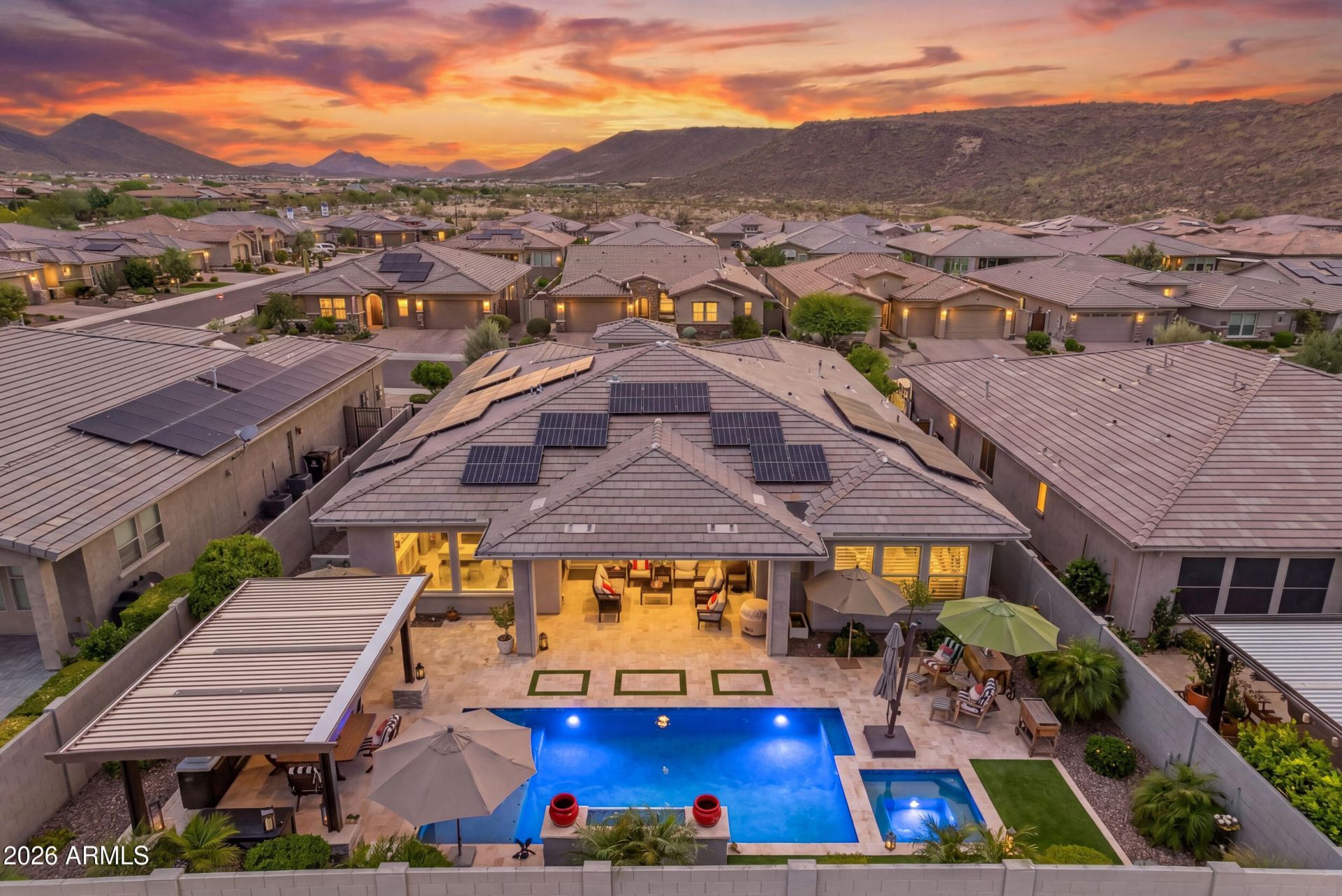 Here is the home you have been looking for, nested in the beautiful Vistancia Village neighborhood! 2021 build, this home has been meticulously maintained and upgraded throughout. Starting as you enter the custom front iron gate and private courtyard that welcomes you home. Inside you will find matching tiled floors throughout and complimentary Sherwin Williams Suede paint offering a neutral pallet ready for your designer touches. Two flex spaces in addition to the three bedrooms are thoughtfully laid out to maximize space.The primary retreat has backyard access, custom electric pirouette shutters, full closet build out and lighting. The main gathering area of this home is the expansive kitchen, living and dining room space. You will find pull outs in the kitchen cabinets, GE Cafe appliances and LG ThinQ cabinet depth refrigerator that makes 3 types of ice cubes! Extra storage comes from the walk in pantry and a full wall of cabinetry including glass front upper cabinets in the dining area plus a beverage fridge. Entertaining will be a breeze gathered around the oversized island with modern matte finish sink and gooseneck faucet. Upgraded designer lighting ties the entire space together. The show stopping backyard is an extension of the main living area with upgrades galore including 90 degree, corner stacking, slider doors that create a seamless corner opening between indoor and outdoor living spaces. Enjoy your heated pool and spa year round, serene water feature, lighting and dedicated pergola for shade and relaxation. The 7 extended patio is equipped with custom electric remote controlled sun shades to fully enclose the patio for privacy or sun protection. Artificial turf along with smart landscaping and plants make this oasis a space you can enjoy for years to come!As if that was not enough, this home has 44 owned solar panels with 2 power walls offering maximum efficiency. 220V power outlet in the 4 car garage, epoxy flooring, overhead storage system, sleek black garage cabinetry with locks and temperature controlled mini split AC system including remote. The only thing this house is missing is you!