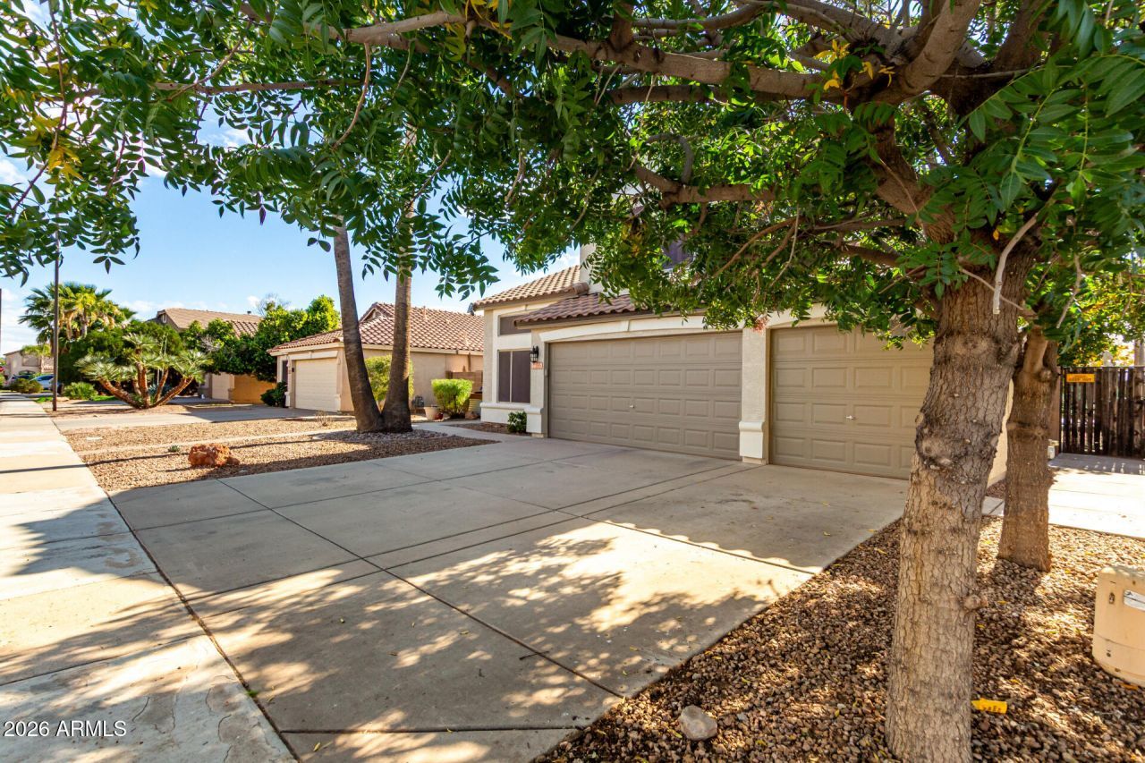 What a beautiful two-story home with a POOL in Western Skies Estates! Situated on a golf course lot, it offers 4 beds, 3 baths, 3-car garage, and a mature landscape. The inviting interior features abundant natural light, recessed lights, and wood flooring w/soft carpet in all the right places. Excellent floor plan with a formal living room and a desirable great room! The impressive kitchen boasts built-in appliances, granite counters, subway tile backsplash, a walk-in pantry, white shaker cabinetry, and a breakfast bar. The double-door bedroom downstairs can be an office. Head upstairs to find the other bedrooms, along with a cozy loft! The large main bedroom has a double-door entry, a bay window w/plantation shutters, and an ensuite w/dual vessel sinks & a walk-in closet. Youll love the backyard oasis with a covered patio, Pergola, fire pit, lush lawn, and a sparkling play pool! Its view fence lets you enjoy the tranquil golf course vistas. There is a citrus tree & storage shed on side yard. Dont miss this great opportunity!