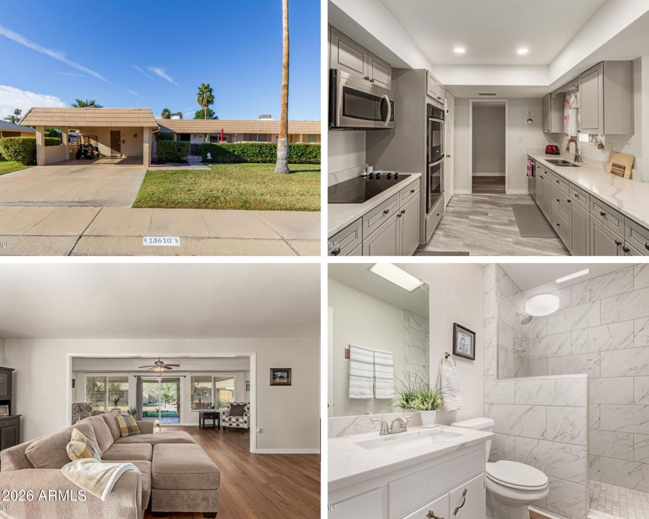 Seller to pay 10K on the remaining 12 years of the solar lease! Solar provides a very low bill or a credit monthly. This beautifully furnished twin home has a private, fenced courtyard. The kitchen has been completely Remodeled with ample storage, breakfast bar, Quartz countertops, and a bright eat-in area overlooking the courtyard. New tile in the kitchen and new neutral laminate flooring throughout the rest of the home with an extended great room with French doors to the primary suite featuring a walk-in shower and closet. Guest room offers built-ins, guest bath has a walk-in shower. New roof in December W 10yr Transferable warranty + solar for BIG savings. Updated Vinyl windows, and slider door. Close to spring training, Cardinals stadium, Arrowhead mall and much more