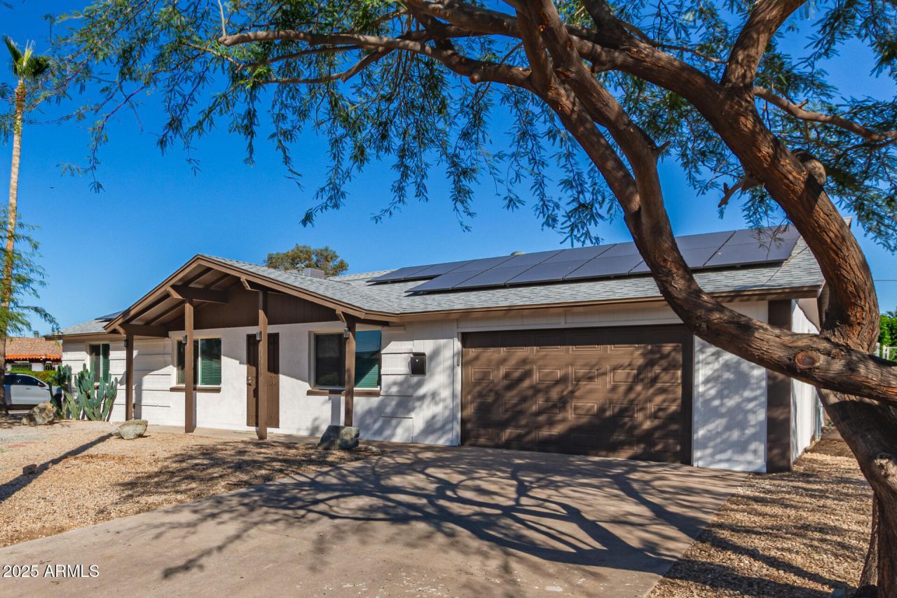 Say goodbye to your APS bill! With 41 solar panels, the seller has NOT had a bill since 2023 and she gets a rebate check at the end of the year! PAID OFF SOLAR, NEWER ROOF, NEWER AC, NO HOA, and home has recently been renovated. This 3 bedroom, 2 bath, 2 car garage has an additional 4th bedroom that is separate from the house and sits on a large CORNER LOT with an RV GATE, a 20 ft Steel shop with solar lights that match the house and located in the Paradise Valley Unified school district which is consistently ranked among the top districts in Arizona and right across the street from Great Hearts!
