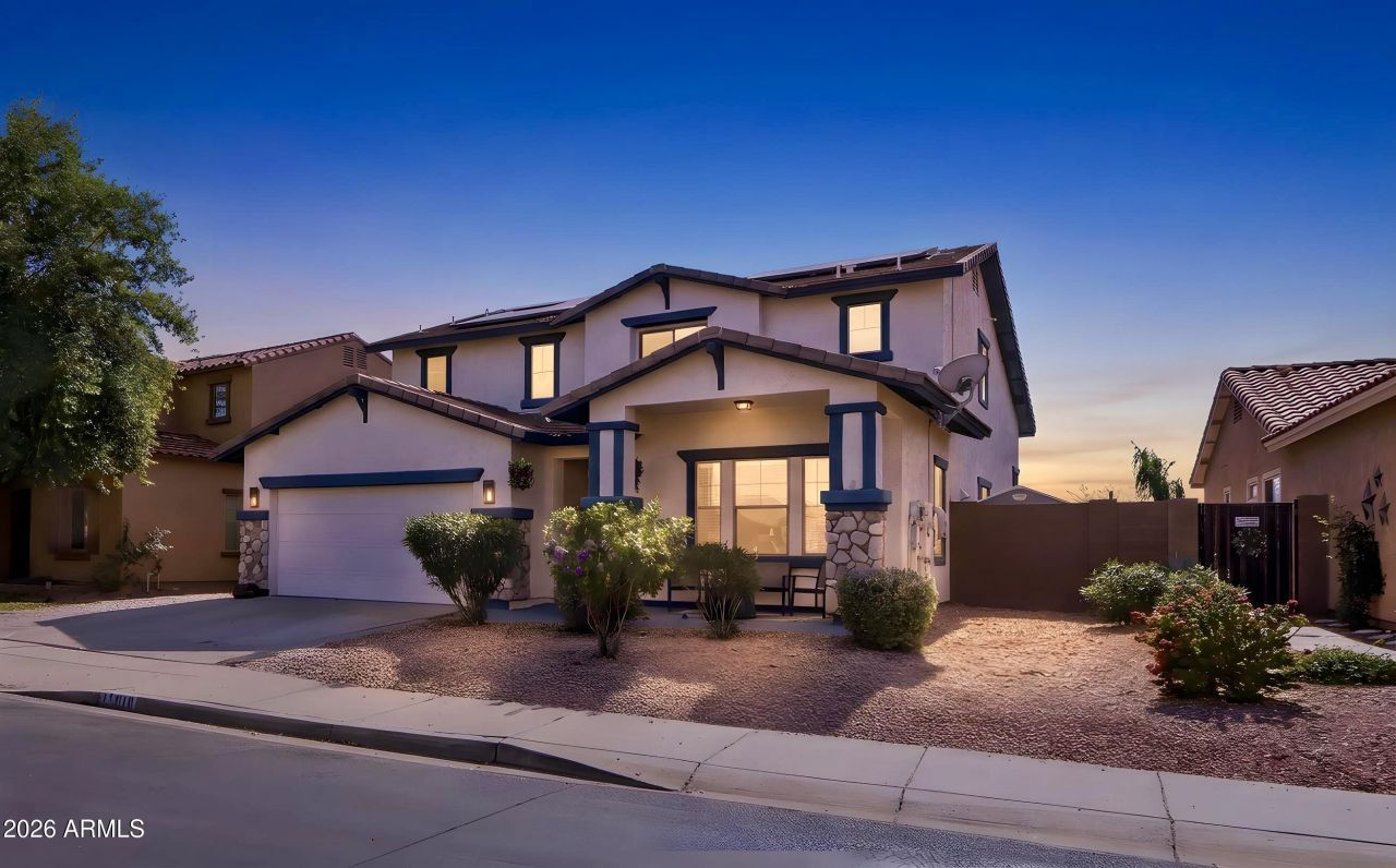 Beautiful Belize Model by Shea Homes with stone front elevation in desirable Sierra Montaña! Move-in ready 5BR, 3BA home featuring two bedrooms and a full bath downstairs plus a formal dining room or den. Spacious Primary Suite offers separate tub and shower, double vanity, and large walk-in closet. Two additional bedrooms share a Jack & Jill bath. Open kitchen includes oversized island, breakfast bar, abundant cabinetry, pantry, and all appliances. Backyard boasts grass area, covered patio, and two built-in sheds that convey. Excellent location near the community park with easy access to Loop 303, shopping, dining, and more.