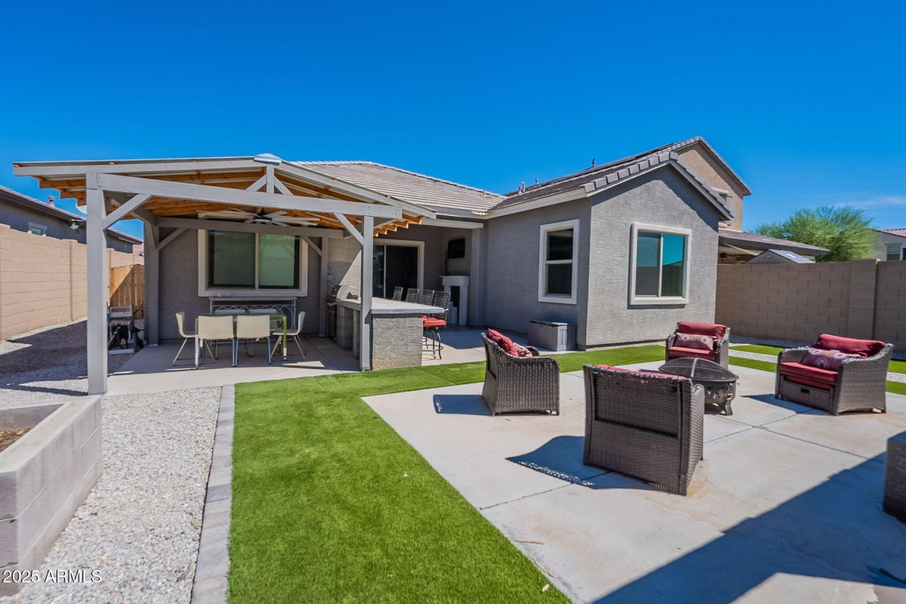 Built in 2020, this stunning single-level home features 3 bedrooms, 2.5 baths, plus a private office and 2-car extended length 24 ft garage, big enough for your truck! Inside, enjoy upgraded wood-look tile flooring, a gourmet kitchen with a large granite island, designer backsplash, wall oven, and hood. The luxurious primary suite boasts a walk-in tiled shower. Outdoors, entertain in style with a covered patio, pergola, built-in BBQ and bar, and a serene fountain. A perfect blend of modern upgrades and resort-style living! Less than 10 minute drive to shopping, dining and entertainment in the Village at Prasada!