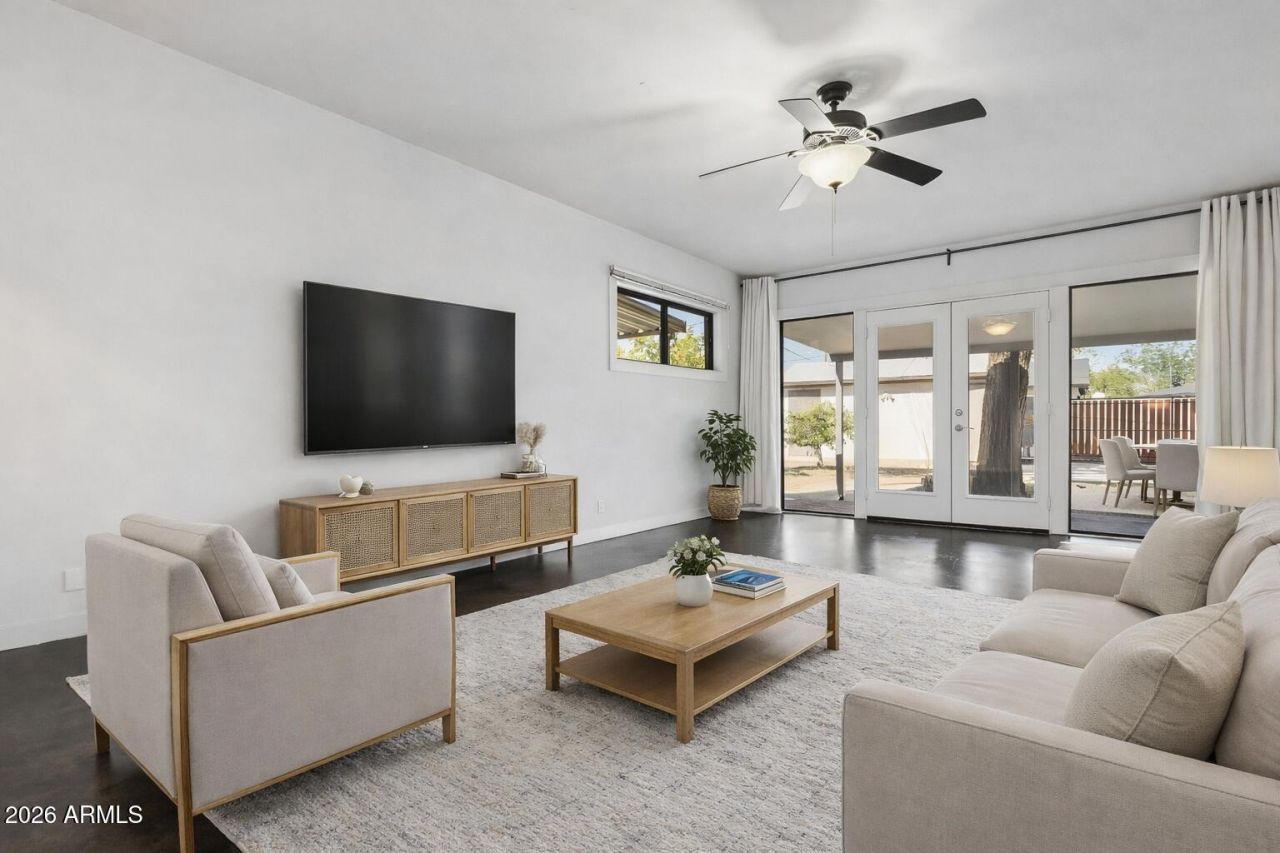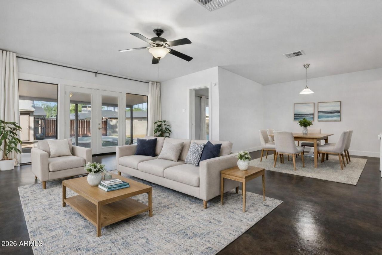 Modern, flexible, and influenced by mid-century design, this beautifully updated home sits on an oversized lot and offers a layout that truly lives well. Raised ceilings through the hallway and polished concrete floors enhance the sense of space, while the open connection between the kitchen, dining, living area, and patio creates a bright, airy feel ideal for everyday living and entertaining.A versatile bonus room provides the perfect space for a home office, studio, or guest room, and two exterior workshops add rare functionality for hobbies, storage, or creative projects. Major improvements include updated drain lines throughout the home, offering added peace of mind for future owners. Outdoors, enjoy multiple patios, mature orange and grapefruit trees, an epoxied garage, covered parking, and an RV gateall designed for flexibility and convenience. Just minutes from downtown Phoenix, major freeways, golf courses, shopping, and dining, this home delivers space, style, and versatility in a central location that continues to grow in demand.