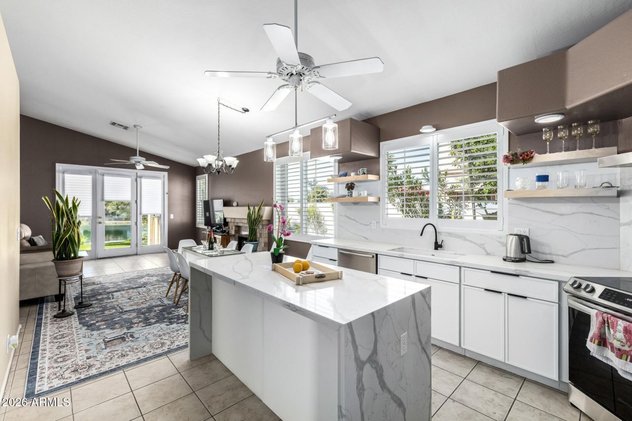 Welcome to 3660 S Heath Way, a beautifully updated 3-bedroom, 2-bath home with a versatile bonus room off the primary suite. Perfectly positioned on a premium waterfront lot, this property offers tranquil lake views and a wider homesite for added privacy and outdoor enjoyment.The recently remodeled kitchen showcases modern, timeless finishes including quartz countertops with a dramatic waterfall edge, a marble-look backsplash, updated fixtures, and contemporary lighting. The kitchen is designed for flexibility with both gas and electric cooking options available. The backyard is a true oasis featuring lush green grass, professionally manicured trees, multiple fruit trees, a charming swing beneath a mature shade tree, and additional usable side-yard space. A relaxing hot tub conveys with the home--perfect for enjoying peaceful evenings overlooking the water.Additional highlights include epoxy garage flooring, neutral finishes throughout, and a move-in ready condition that makes this home stand out in todays market.Conveniently located near shopping, dining, and golf, this rare waterfront property combines lifestyle, comfort, and thoughtful updates in one exceptional offering.
