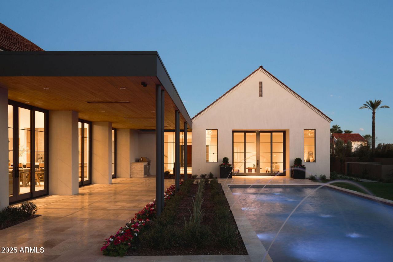 Vista General has once again raised the bar in new construction, delivering a flawless blend of modern organic architecture and high-end designer detail???all nestled in one of Arcadias most coveted pockets with front-row views of Camelback Mountain. Warm oak flooring, vaulted ceilings, and a limestone fireplace set the tone for sophisticated yet approachable living. The kitchen is a culinary and visual centerpiece, featuring Taj Mahal quartzite counter tops, dual Asko dishwashers, Sub-Zero refrigerator and freezer, and a stunning back kitchen and wet bar that perfectly frame the mountain backdrop. The main house offers 5 spacious en-suite bedrooms, plus an upstairs media lounge with a snack bar???ideal for cozy movie nights or casual entertaining. The primary suite is a private sanctuary overlooking the sparkling pool, complete with a spa-like bathroom featuring a soaking tub, walk-in shower, and an oversized dressing closet with Taj Mahal peninsula and in-suite laundry. A beautifully appointed detached guest house provides ultimate flexibility with a full bedroom, bath, living area, and kitchenetteperfect for extended guests or a luxe home office setup. Outdoors, the resort-style amenities continue: a serene pool, spa, fire feature, and private pickleball court make this home as functional as it is fabulous. This is elevated Arcadia living-here architectural integrity meets everyday comfort, and the mountain views are just the beginning
