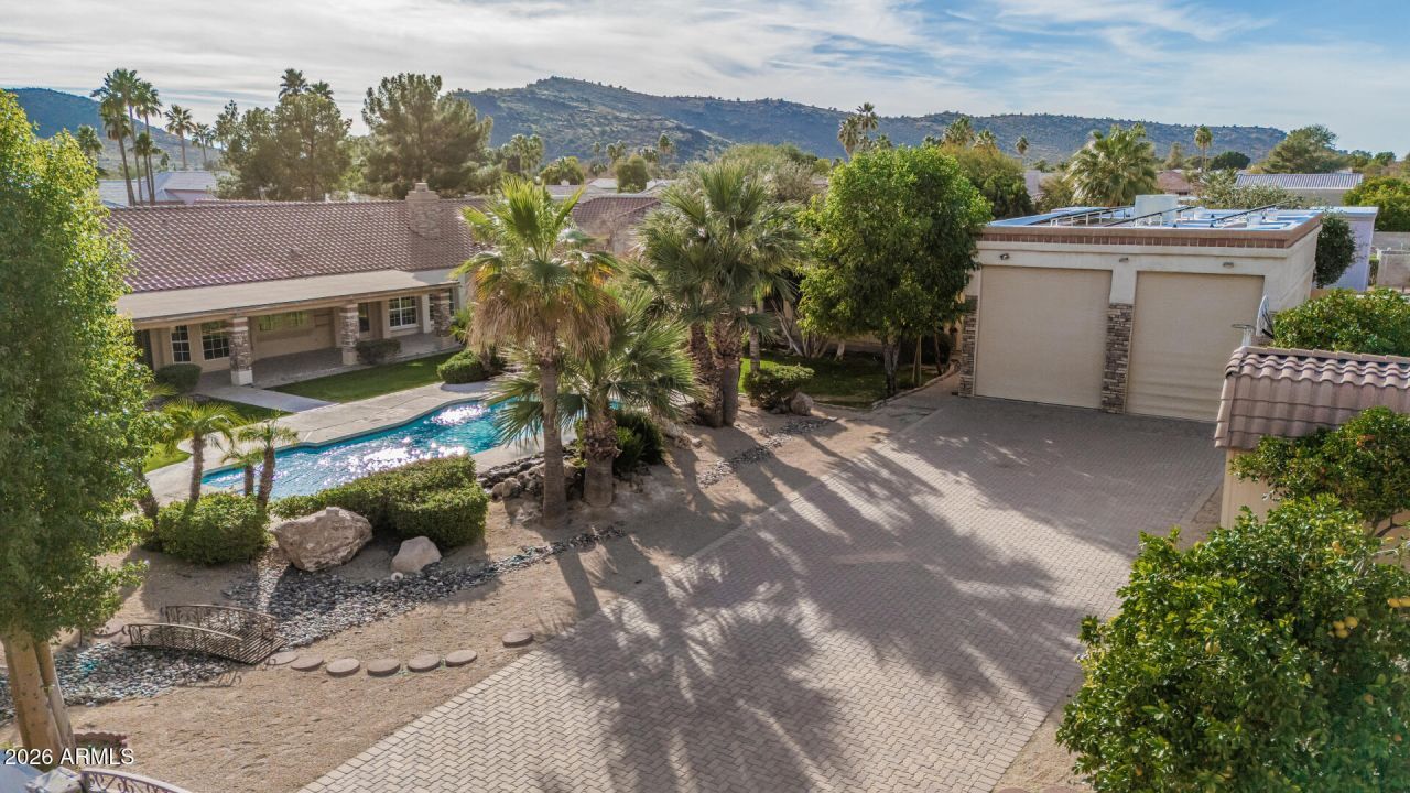 HARD TO FIND SINGLE LEVEL BLOCK HOME ON ALMOST AN ACRE WITH RV GARAGE, CASITA, MTN VIEWS & OWNED SOLAR! 1269SF RV Garage on corner for easy entry with huge pavered driveway, electronic gates, 540 sf casita with full kitchen & full bath, pebbletec pool & lush gorgeous landscaping. Main home (3849sf) features a split primary suite, an additional 3 bedrooms, a game room, office and an additional office area (hobby room) with separate exit off laundry room. All roofs have been redone (solar located on casita and RV garage roof only) ACs replaced in 2023. Almost all windows replaced. Vaulted ceilings, light & bright large windows overlooking backyard. This home is priced under market to give buyer ability to update it. Surrounded by multi million homes! The chefs kitchen has a center island, abundant cabinetry, granite counters, tile backsplash, built-in appliances, & a charming breakfast nook highlighted by a sunny bay window. A perfectly sized den provides flexible living space for an office! Huge main bedroom is a true sanctuary with its own backyard access, a bay window, a walk-in closet, & a lavish bathroom w/dual vanities, a jetted tub, & a shower w/glass block wall. Secondary bedrooms are comfortably carpeted & share a convenient Jack-&-Jill bathroom. The laundry room includes a sink & built-in cabinets for convenience. Fall in love with the detached casita offering a bathroom, full kitchen, & open common areas, making it ideal for guests or extended family. Backyard oasis comprises sparkling blue pool, grassy areas, shade/citrus trees, covered patio, lovely pavers, storage shed, & breathtaking mountain views. This remarkable property also includes a sided RV gate, parking, & garage for all your toys! See it, love it, live it!