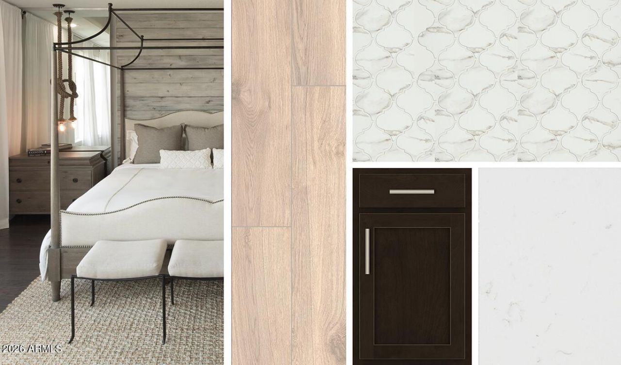 Welcome to this stunning Sage plan, a beautifully designed 2,150 sq. ft. home offering 4 bedrooms, 3 bathrooms, and a versatile den, perfect for working from home or extra living space. This modern residence features a striking paver driveway and a sleek modern desert contemporary exterior that perfectly complements the surrounding landscape.Upon entering, youll immediately be impressed by the 9-ft ceilings and 8-ft interior doors throughout, enhancing the homes open, airy feel. The expansive great room is a true highlight, featuring a center sliding door that opens to the backyard, seamlessly blending indoor and outdoor living. Perfect for hosting gatherings or enjoying quiet moments, the space is filled with natural light and offers an open, airy atmosphere situated on a nice end homesite.This home features our elegant Roosevelt collection offering modern desert-inspired architecture with luxurious finishes. The kitchen showcases 42-inch espresso brown kitchen cabinets that give a fresh, modern aesthetic with a satin nickel hardware finish. The white Carrara Breeze quartz island adds a touch of luxury, while the stunning mosaic backsplash provides a pop of texture. The kitchen is equipped with an undermount stainless steel sink, ensuring both style and practicality. Sleek satin nickel bathroom fixtures and door hardware throughout the home adds a touch of sophistication and cohesiveness throughout. All stainless-steel appliances including a gas stove, dishwasher, microwave and fridge are included.The flooring throughout the home has been thoughtfully chosen to enhance the overall design. Gorgeous 8x36 neutral wood look plank tiles grace the main living areas, providing a stylish, easy-to-maintain surface that complements the homes modern finishes while plush carpeting sits in the bedrooms and den. The open-concept layout connects the kitchen, dining, and living areas, creating a perfect flow for everyday living or entertaining.The primary suite offers a peaceful retreat with ample space, and the en-suite bathroom features satin nickel finishes, dual sinks, quartz countertops and ample storage. Designed with practicality in mind, this home also features a 3-car tandem garage, providing plenty of space for vehicles, storage, or hobbies. Additional features include a soft water loop, garage door opener, window coverings, and washer and dryer for that turnkey feel.This Sage plan home is ideal for those who appreciate both modern style and functional living. With its luxurious finishes, open layout, and thoughtful design, its a home that truly has it all.