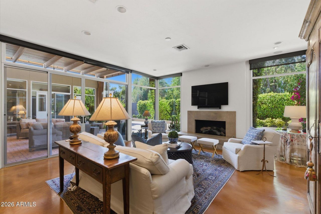 Spectacular OPPORTUNITY! Elegant architecture with international appeal set on a LARGE, ULTRA-PRIVATE LOT in an enviable Paradise Valley location. This rare, single-level residence was thoughtfully designed with two primary suites plus a separate office/den with bath and walk-in closet for 3rd bedroom option. Stunning concrete floors, soaring 10-foot ceilings, and dramatic floor-to-ceiling glass windows create an impressive volume of space filled with natural light. Indoor and outdoor living blend seamlessly with expansive covered entertaining area surrounded by a lush, landscaped garden, built-in BBQ, and fireplace complimented by a lemon-covered pergola. Move-in ready with strong remodel potential, just moments from world-class dining, shopping, and entertainment!