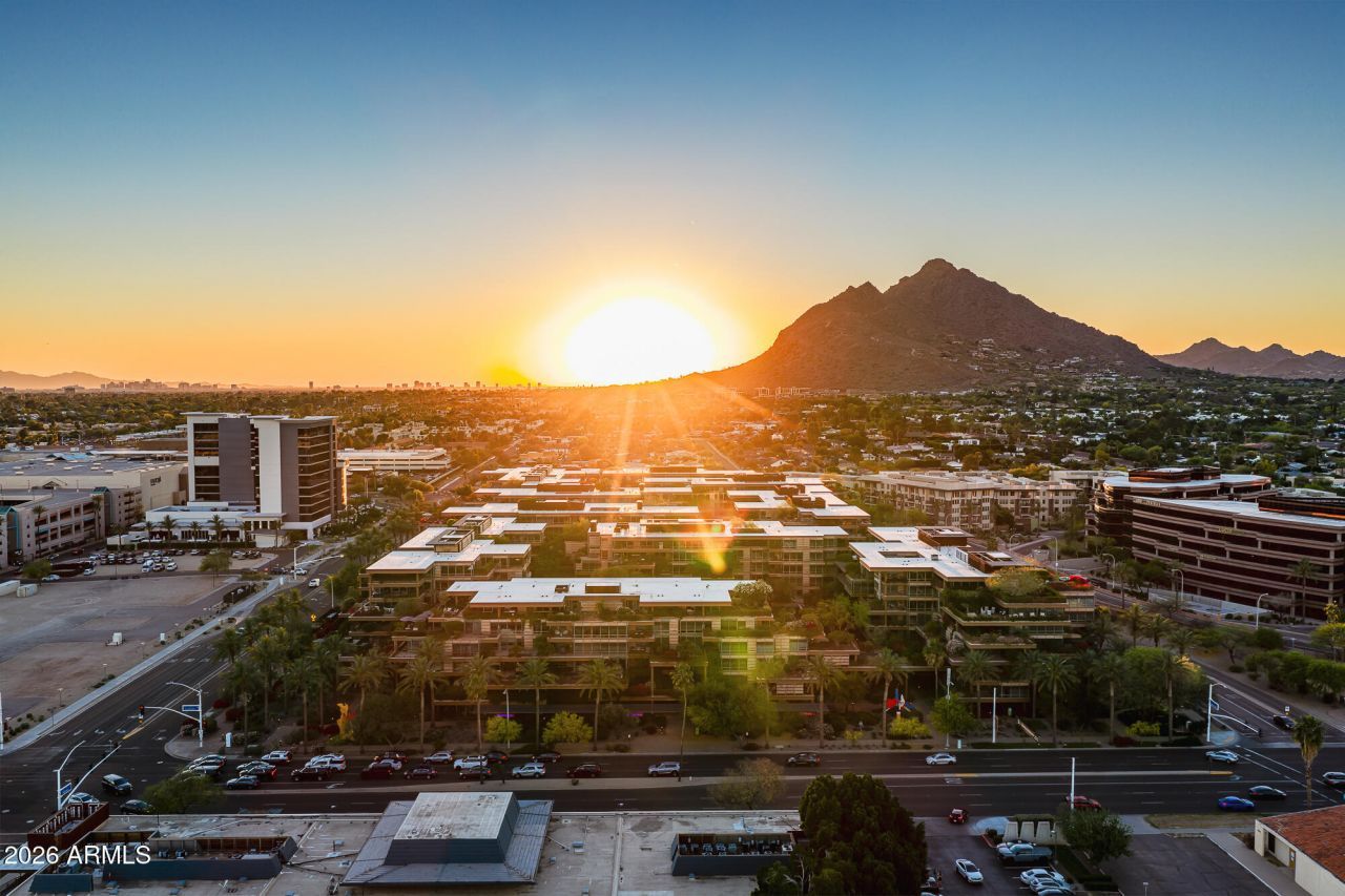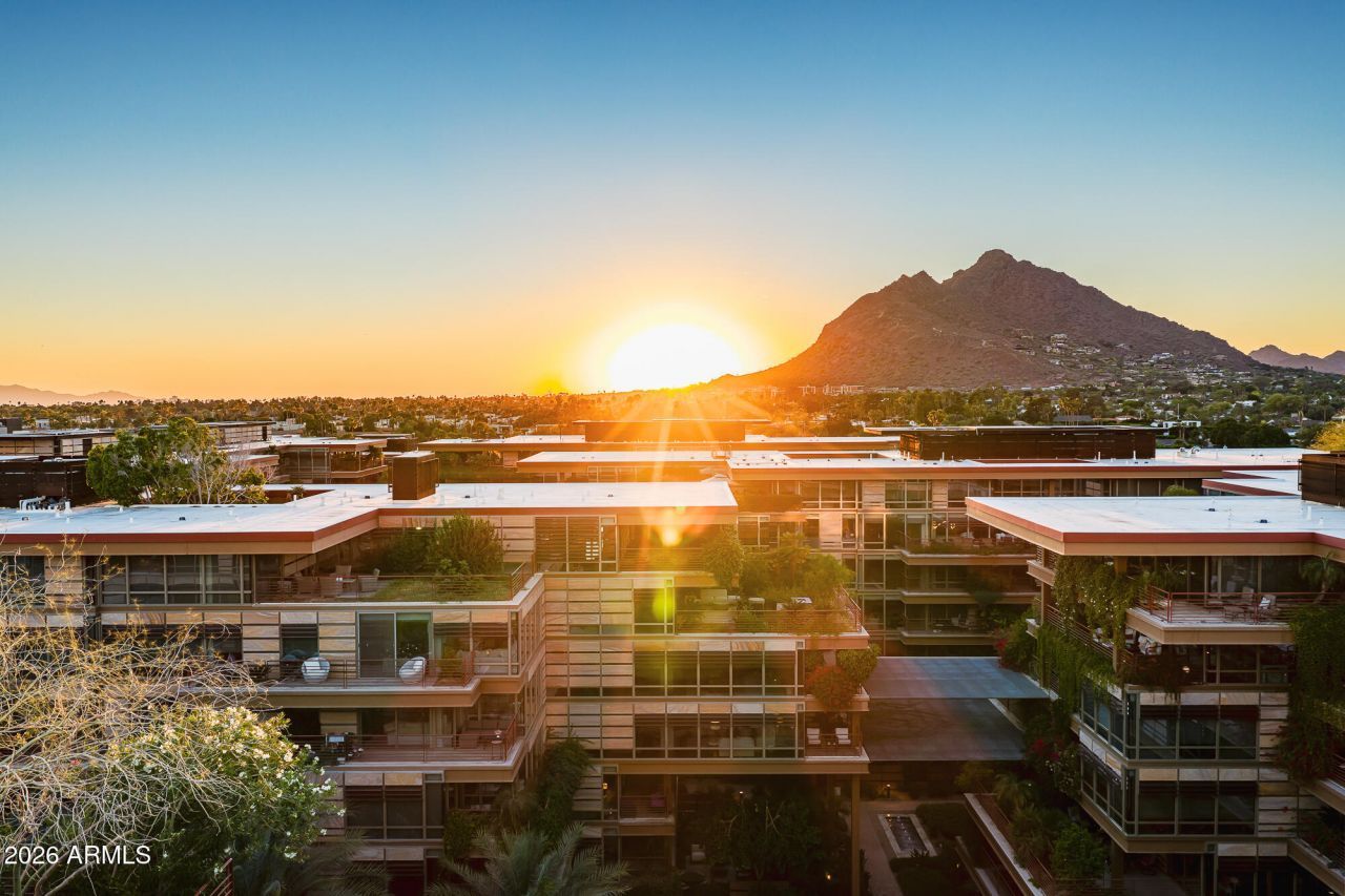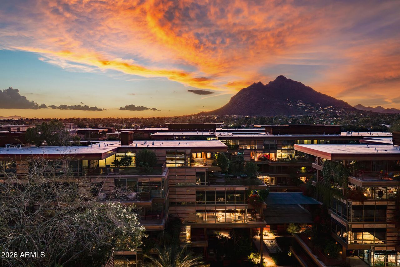 SPECTACULAR TOP-FLOOR OPTIMA CAMELVIEW PENTHOUSE???COMPLETELY REIMAGINED. This one-of-a-kind residence showcases an extensive, designer-level remodel with Italian Venetian plaster walls and breathtaking Camelback Mountain views from nearly every living space. The expansive great room opens to a massive north-facing patio, perfect for indoor-outdoor entertaining, and features a drop-down TV projector for a true cinematic experience.The chefs kitchen is outfitted with dual Sub-Zero refrigerator/freezer, custom cabinetry, and refined finishes???ideal for hosting at scale. A whole-home Sonos surround sound system flows seamlessly through the interior and outdoor living spaces, including a hidden pop-up TV on the main patio. The primary suite offers a serene retreat with a sitting area and access to two private patios, while the spa-inspired bath stuns with a concealed TV behind a mirrored Maser glass wall. A thoughtfully designed office/den features Camelback views, a movable wall, and glass sliding doors that can close off the guest suite and den for enhanced privacy.Smart-home technology, three rare private patios, and impeccable attention to detail throughout complete this truly unparalleled penthousea rare opportunity to own one of the most refined residences in Optima Camelview.All found within the luxurious Optima Camelview Village, with its unbeatable location & state of the art architecture/amenities. Amenities include: Two Outdoor Zen Pools, Spas & BbqsOne on each side of the community (heated year round). 24,000 sq. ft. Fitness Center (Recently Remodeled). Mens & Womens Locker Rooms w/ Steam Rooms, Showers and Private Lockers. Indoor Lap Pool & 2 Spas (Heated year round), On-site concierge, Putting green, Hybrid Basketball / Pickle-ball Court, Racquet ball court, On-site restaurant (metropolis), conference room, 24/7 Security, Reservable party room and multi-purpose fitness/yoga room.