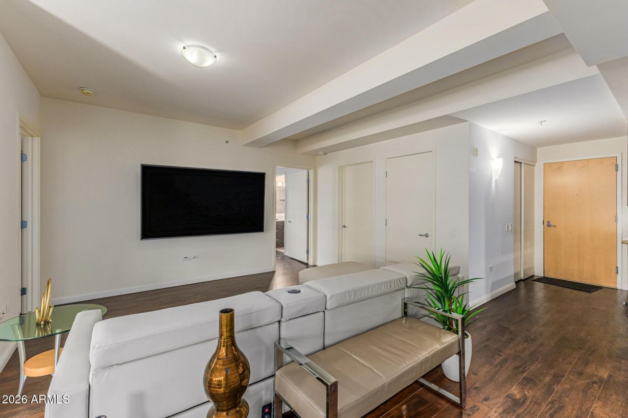 Step inside this beautiful 2 bed, 2 bath residence in Optima Camelview, one of Scottsdales most iconic architectural communities, where garden-inspired design, world-class amenities, and urban convenience come together in one exceptional living experience.This spacious layout offers the rare opportunity to convert the existing floor plan into a true 3-bedroom, creating flexibility for guests, a home office, or expanded living space. Floor-to-ceiling glass windows flood the home with natural light, framing the lush landscaping that defines Optimas signature aesthetic and creating a seamless indoor-outdoor connection.Two expansive, private patios elevate the lifestyle of the home???each offering unmatched versatility. Whether imagined as an outdoor dining terrace, tranquil lounge, or a curated garden escape, the patios provide a blank canvas for the next owners vision.Inside, the home features newer rustic wood-look luxury vinyl plank flooring and an open-concept design that feels inviting yet refined. The gourmet kitchen is perfectly appointed for both everyday living and entertaining, showcasing granite counters with a matching backsplash, rich shaker cabinetry, stainless steel appliances, recessed lighting, and a peninsula with casual bar seating.The primary suite is a peaceful retreat with its own private bath featuring dual sinks and a generous walk-in closet. The guest bedroom and bathroom are equally well-designed, making the home ideal as a primary residence, lock-and-leave, or investment opportunity.Living at Optima Camelview means embracing resort-style living every day. Residents enjoy 24-hour security, concierge services, a state-of-the-art fitness center, indoor lap pool, two outdoor pools and spas, an on-site restaurant, putting green, lounge areas, business centers, and the beautifully engineered landscaping that has become the hallmark of this award-winning community. All just steps from Scottsdale Fashion Square, world-class dining, hiking, and the best of Old Town.A versatile floor plan, two incredible outdoor living spaces, and the unmatched amenities of Optima Camelviewthis is a luxury lifestyle opportunity you wont find twice.