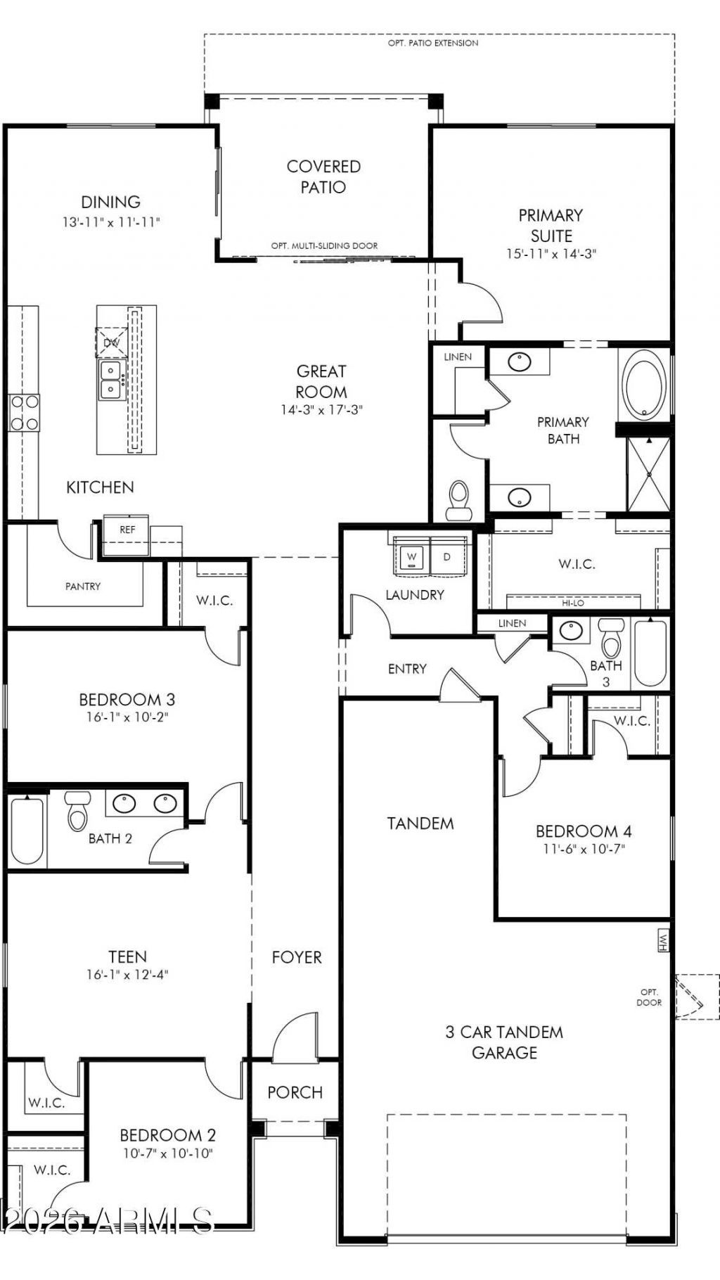 Brand new, energy-efficient home! The Bailey floorplan impresses with its smart, spacious design. This stunning single-level home features 4 generously sized bedrooms and Teen rm, each with its own walk-in closet, providing ample storage and personal space. A 3-car garage tandem adds both convenience and functionality, making the Bailey a perfect blend of comfort and curb appeal. This home offers a GOURMET kitchen with a gas cooktop and separate wall oven, Barnett linen cabinets, quartz kitchen countertops, mosaic backsplash, wood-look tile flooring and carpet in bedrooms INCLUDED-washer, dryer, window blinds, refrigerator and MORE! EXCLUSIVE community amenities! Built with innovative, energy-efficient features designed to help you ENJOY more SAVINGS!