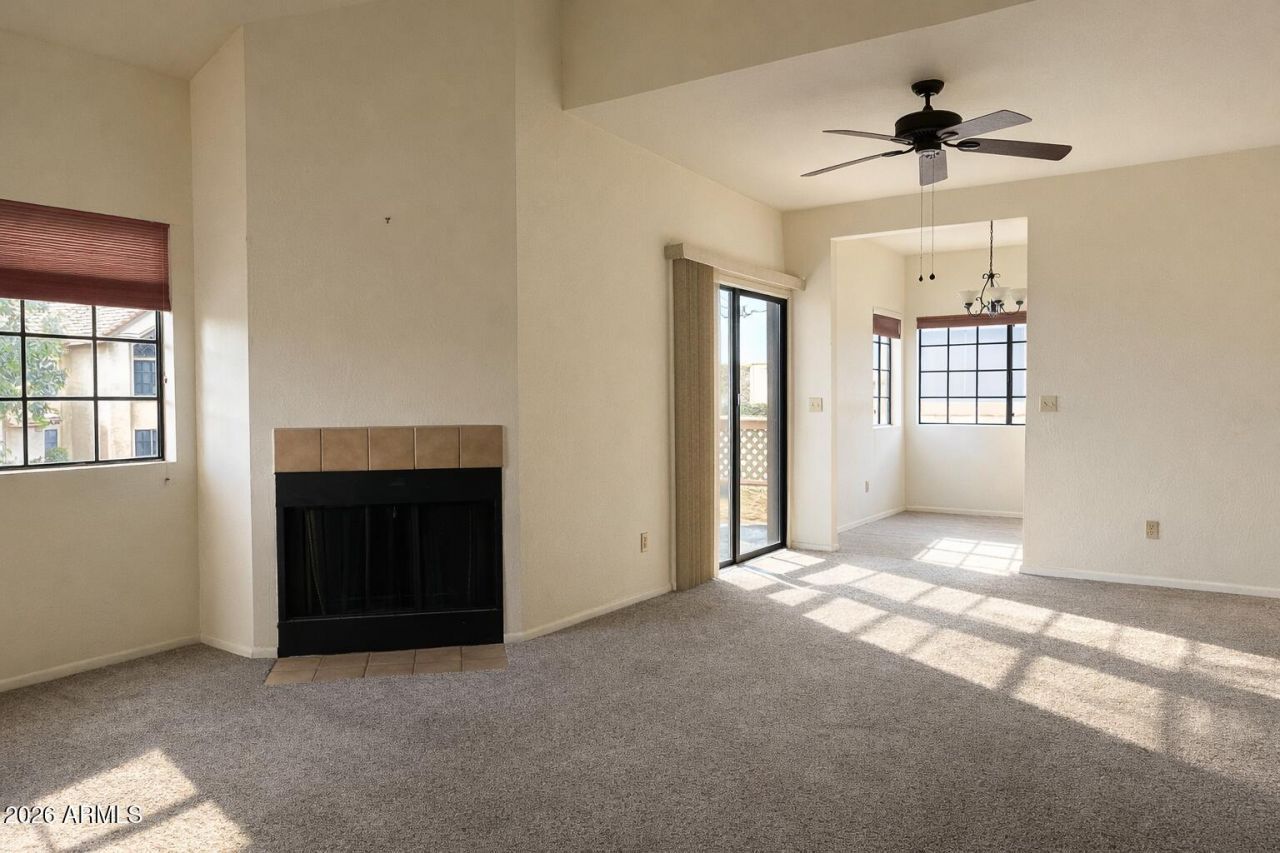 Upper-level condo in a resort-style community featuring LVP flooring in kitchen, dining, and hall, newer carpet in living areas and bedrooms, and a cozy wood-burning fireplace. Kitchen includes GE Spacemaker microwave, Whirlpool glass-top range, Kenmore refrigerator with ice maker, stainless dishwasher, upgraded lighting, and breakfast nook with chandelier. Two bedrooms with mirrored closets, two full baths with upgraded lighting, indoor laundry, and Carrier HVAC. West-facing balcony offers sunset views plus storage closet. Convenient courtyard access and community amenities nearby. Ask your agent for the full photo package and 3D tour.